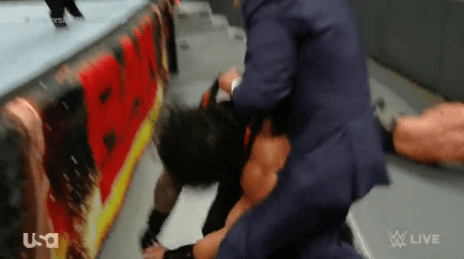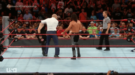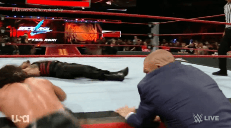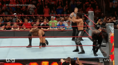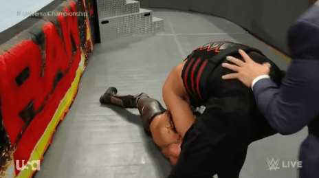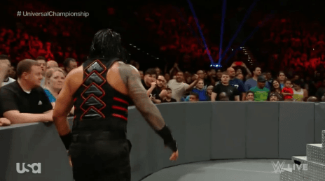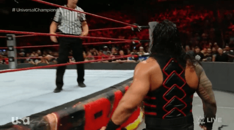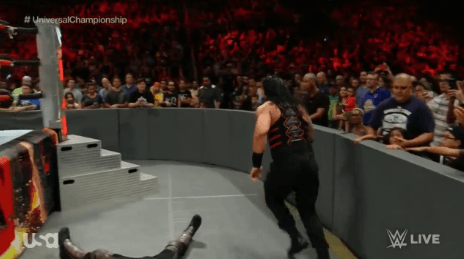 링 밖에서 남은 선수들을 정리하는 로만 레인즈