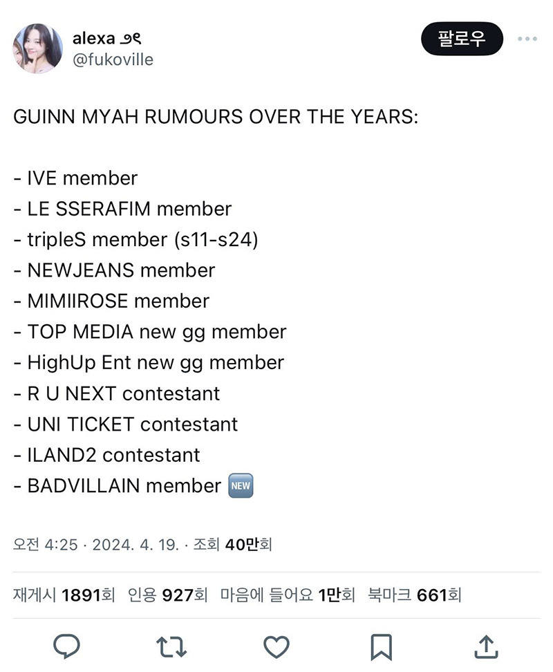 최근에는 소소하게..^^... 미야오 멤버라는 루머도 해외에서 돌았고 JYP 차기 걸그룹 멤버라는 루머도 돌았었음.